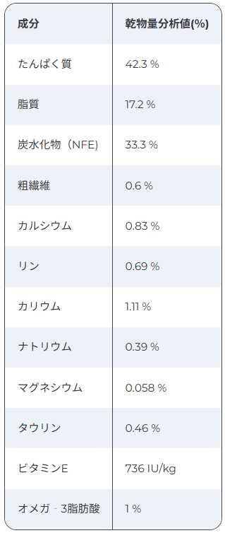 ポーク、チキン、小麦グルテン、フィッシュ、米、コーンスターチ、ニンジン、チキンエキス、動物性油脂、植物性油脂、魚油、ホウレンソウ、加水分解ミルクプロテイン、ミネラル類(カルシウム、リン、ナトリウム、カリウム、クロライド、銅、鉄、マンガン、亜鉛、イオウ、ヨウ素)、増粘多糖類、ビタミン類(B1、B2、B6、B12、D3、E、K、ナイアシン、パントテン酸、葉酸、ビオチン、コリン)、アミノ酸類(タウリン、トリプトファン)