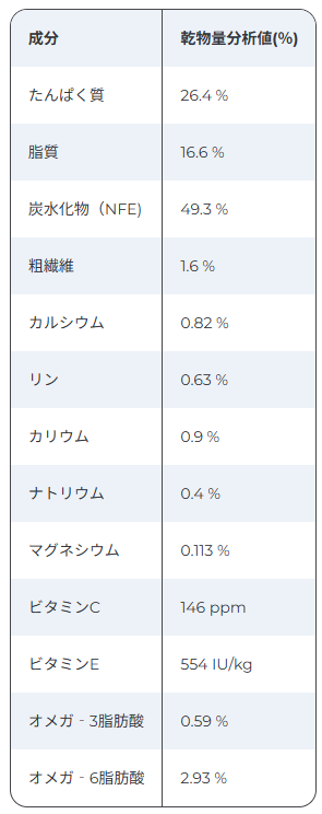 米、ポーク、ターキー、全卵、動物性油脂、チキンエキス、ピーカンナッツ殻パウダー、ビートパルプ、亜麻仁、柑橘類、魚油、クランベリー、ミネラル類(カルシウム、リン、ナトリウム、カリウム、クロライド、銅、鉄、マグネシウム、マンガン、亜鉛、イオウ、ヨウ素)、ビタミン類(B1、B2、B6、B12、C、D3、E、ベータカロテン、ナイアシン、パントテン酸、葉酸、ビオチン)、アミノ酸類(タウリン)、増粘多糖類