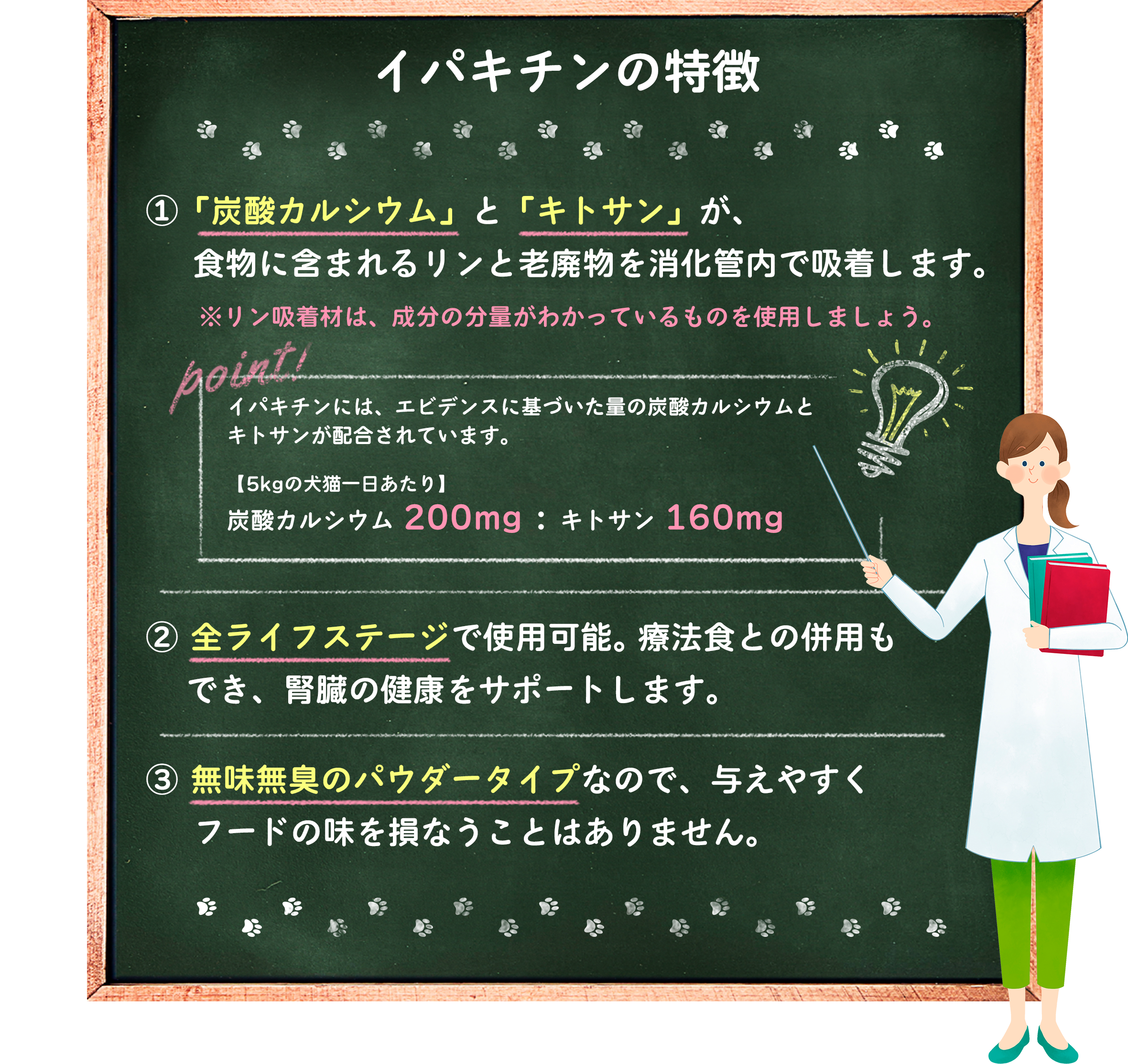 1.炭酸カルシウムとキトサンの2つの働きで消化管内のリンと老廃物を吸着します