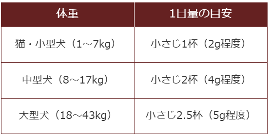 下記の量を目安に、そのまま、またはフードやおやつに混ぜて与えてください。