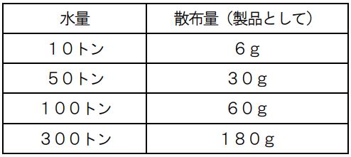 1回量として、飼育水1トン当たりトリクロルホンとして下記の量を均一に散布する。なお、必要に応じて2~3週間の間隔で反復散布する。